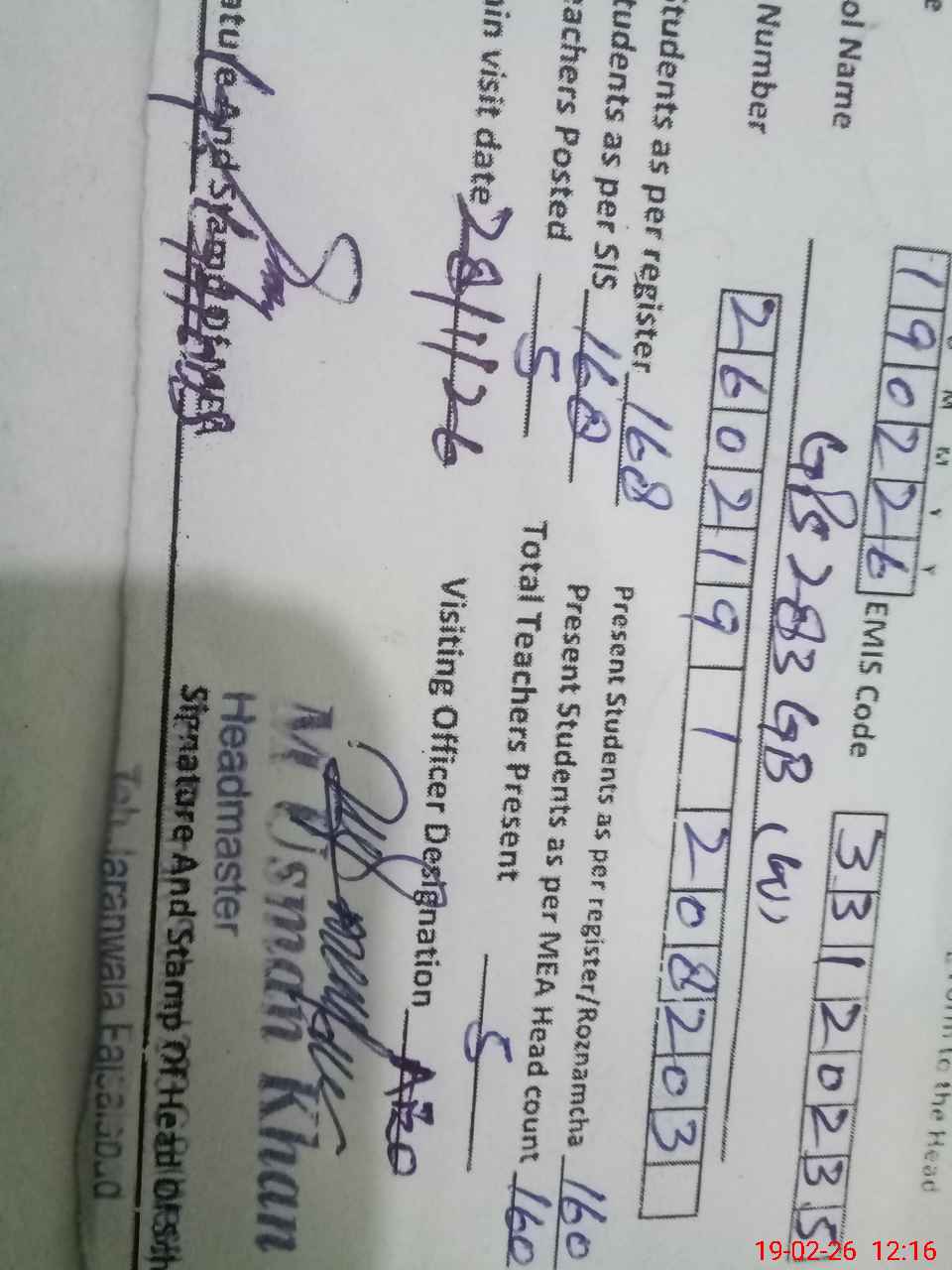 | Certified that this School was Inspected by the Undersigned MEA/DMO Today and the Information Stated Above is as Per Record. | |||||