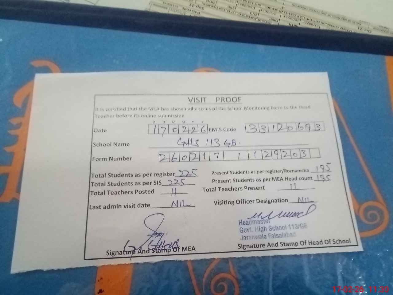 | Attendance Register | Head Teacher | MEA with School | Visit Proof |