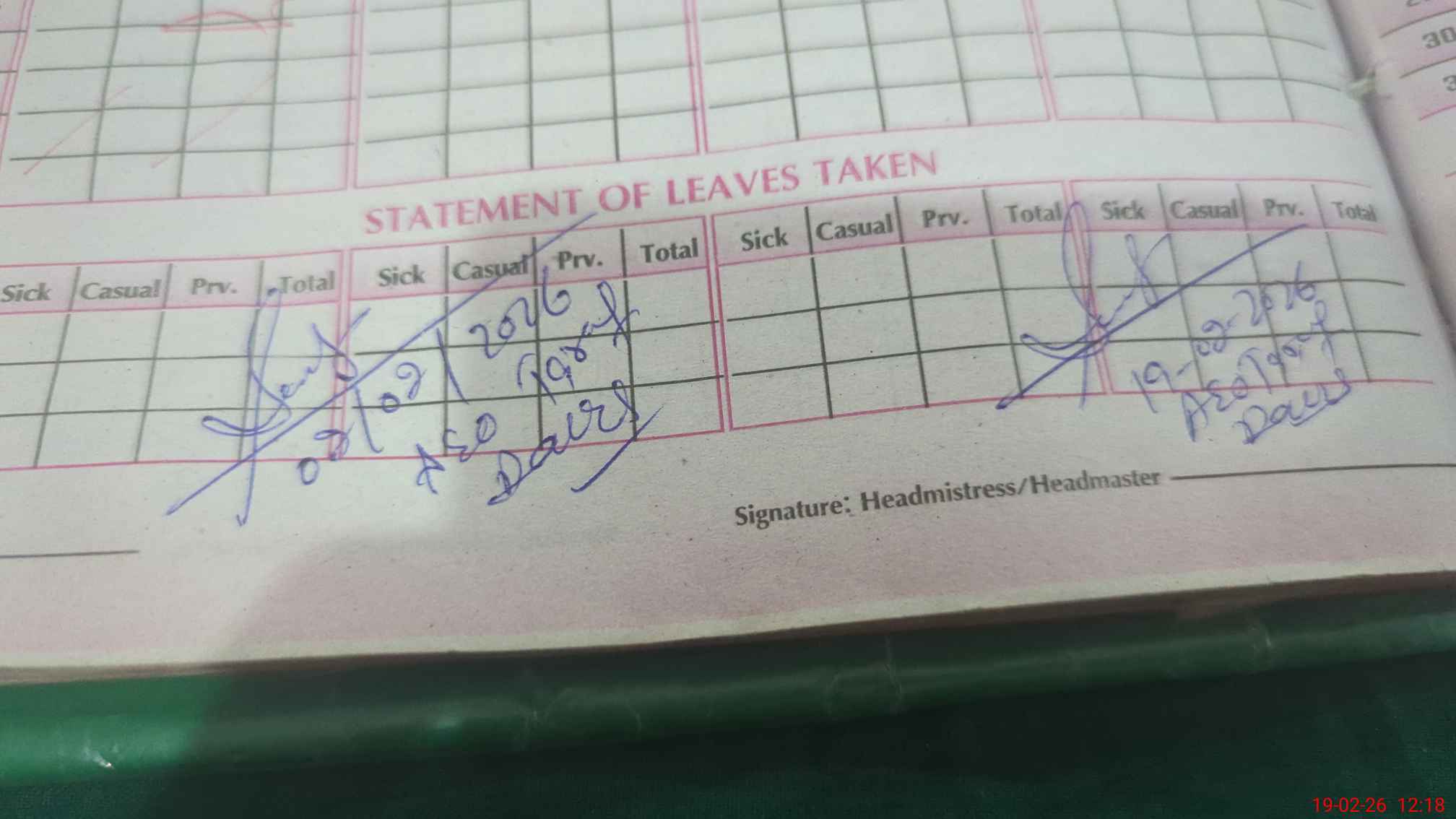 | Leave | Duty | Absent | Maternity | Medical | Ex- Pak |