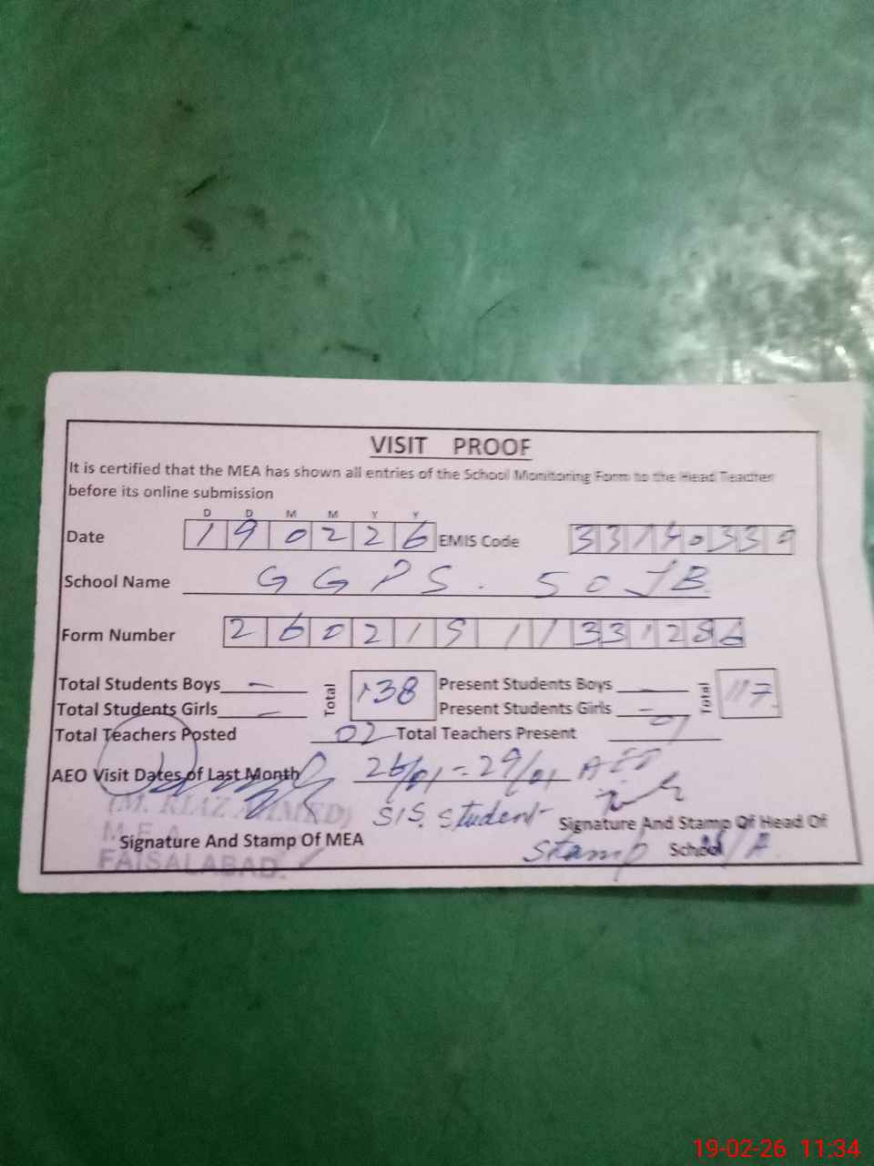 | Attendance Register | Head Teacher | MEA with School | Visit Proof |