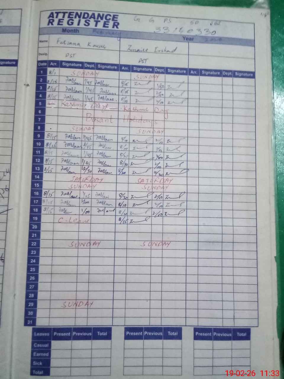 | 33**** | Fa**** Ka**** | PST Arts | Regular | 0 | 0 | 0 | 0 | 0 | 0 | 0 | 0 | 0 | Casual |