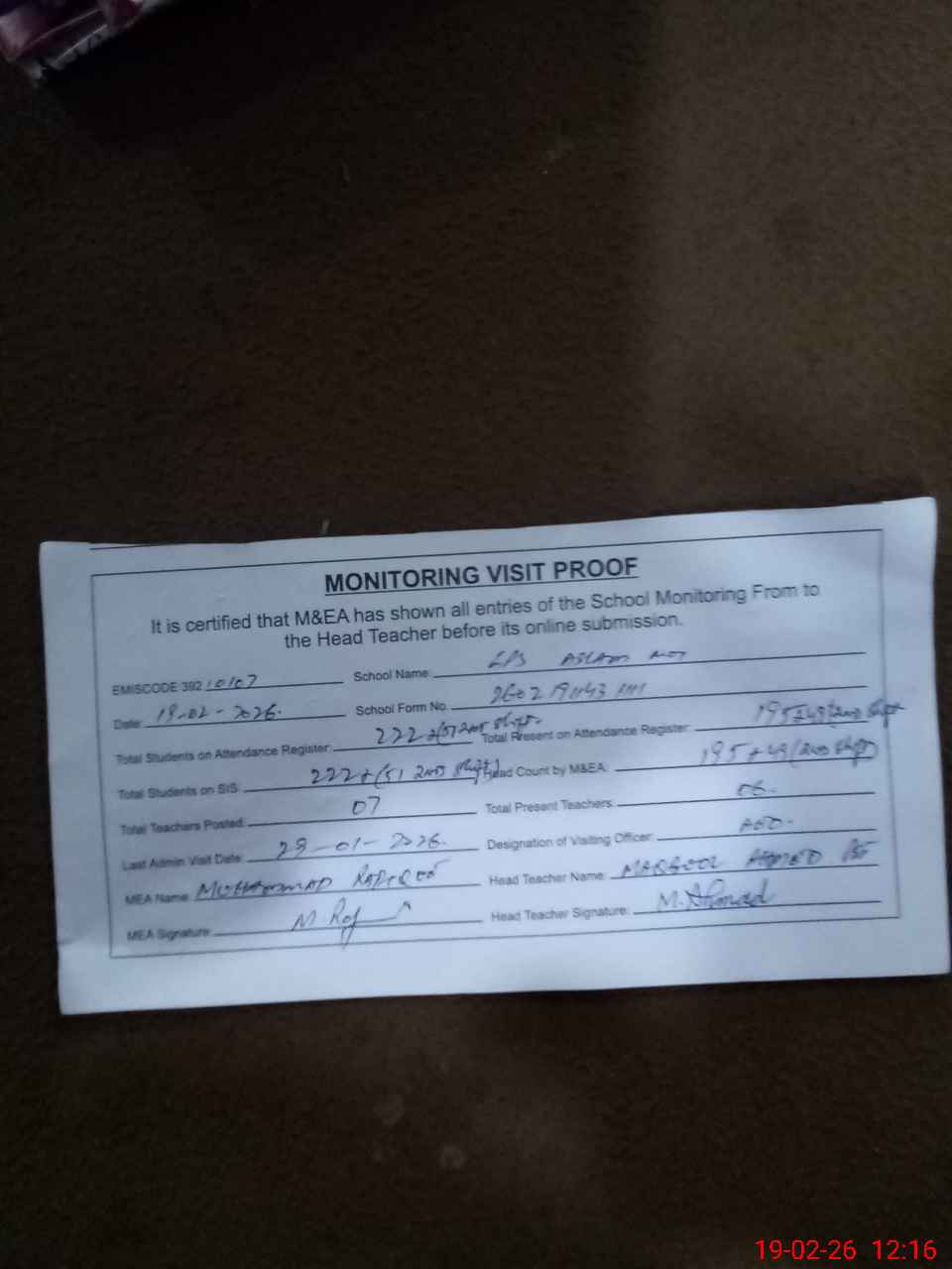 | Attendance Register | Head Teacher | MEA with School | Visit Proof |
