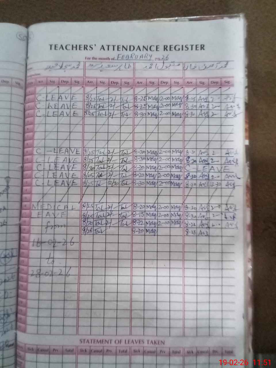 | Leave | Duty | Absent | Maternity | Medical | Ex- Pak |