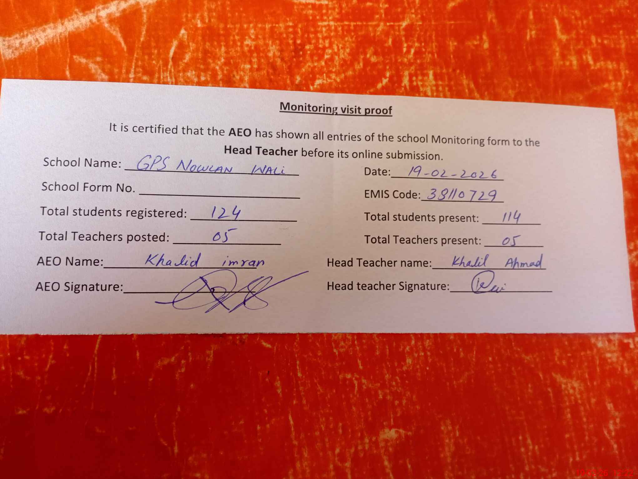 | EMIS Code: 38110729 | Name of School: GPS NOWLAN WALI | |||