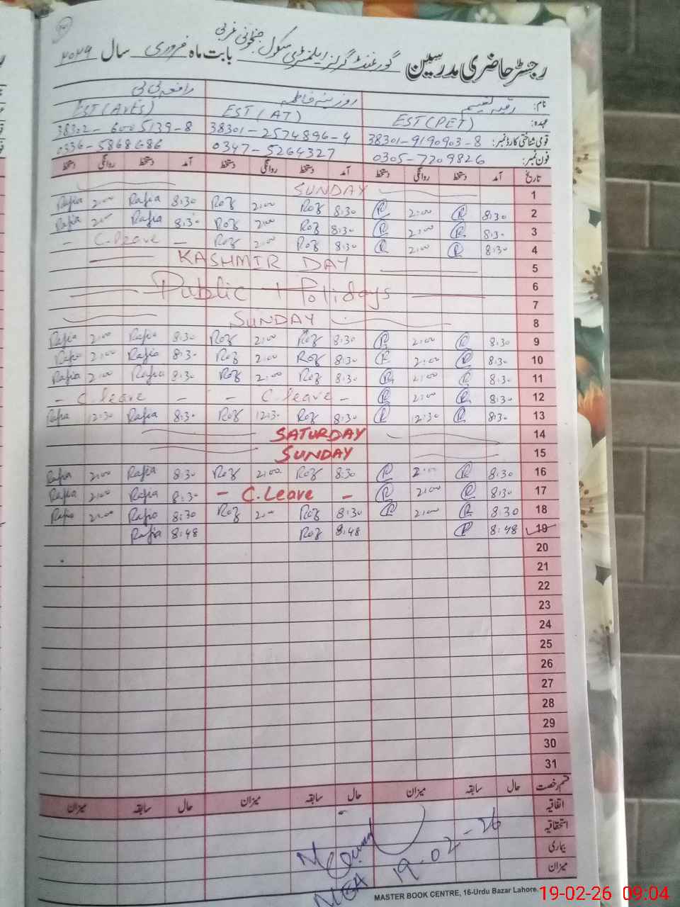 | 38**** | Ri**** Kh**** | NAIB QASID | Regular | 0 | 1 | 0 | 0 | 0 | 0 | 0 | 0 | 0 | Absent (Un-Authorized) |