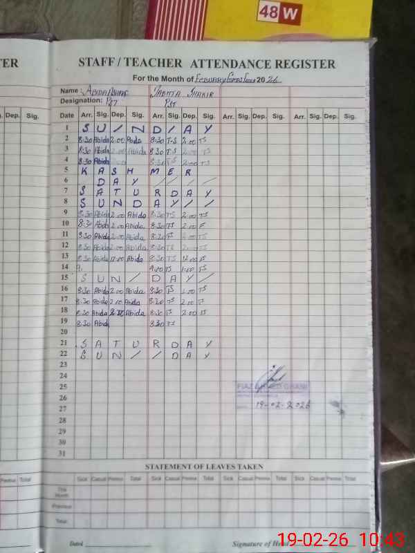 | Remarks (Use Separate Page if Required): Attendance of teaching staff and students on SIS Software is not updated NSB Record Register is not updated at the time of visit Data as per provided by School Staff and found during physical visit | |||||
