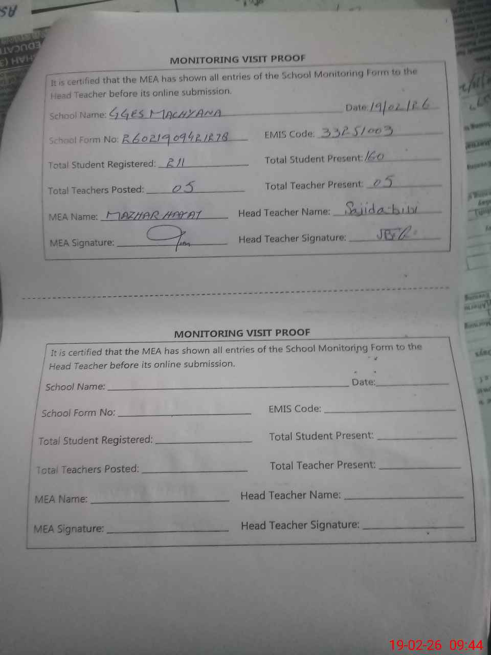 | Certified that this School was Inspected by the Undersigned MEA/DMO Today and the Information Stated Above is as Per Record. | |||||