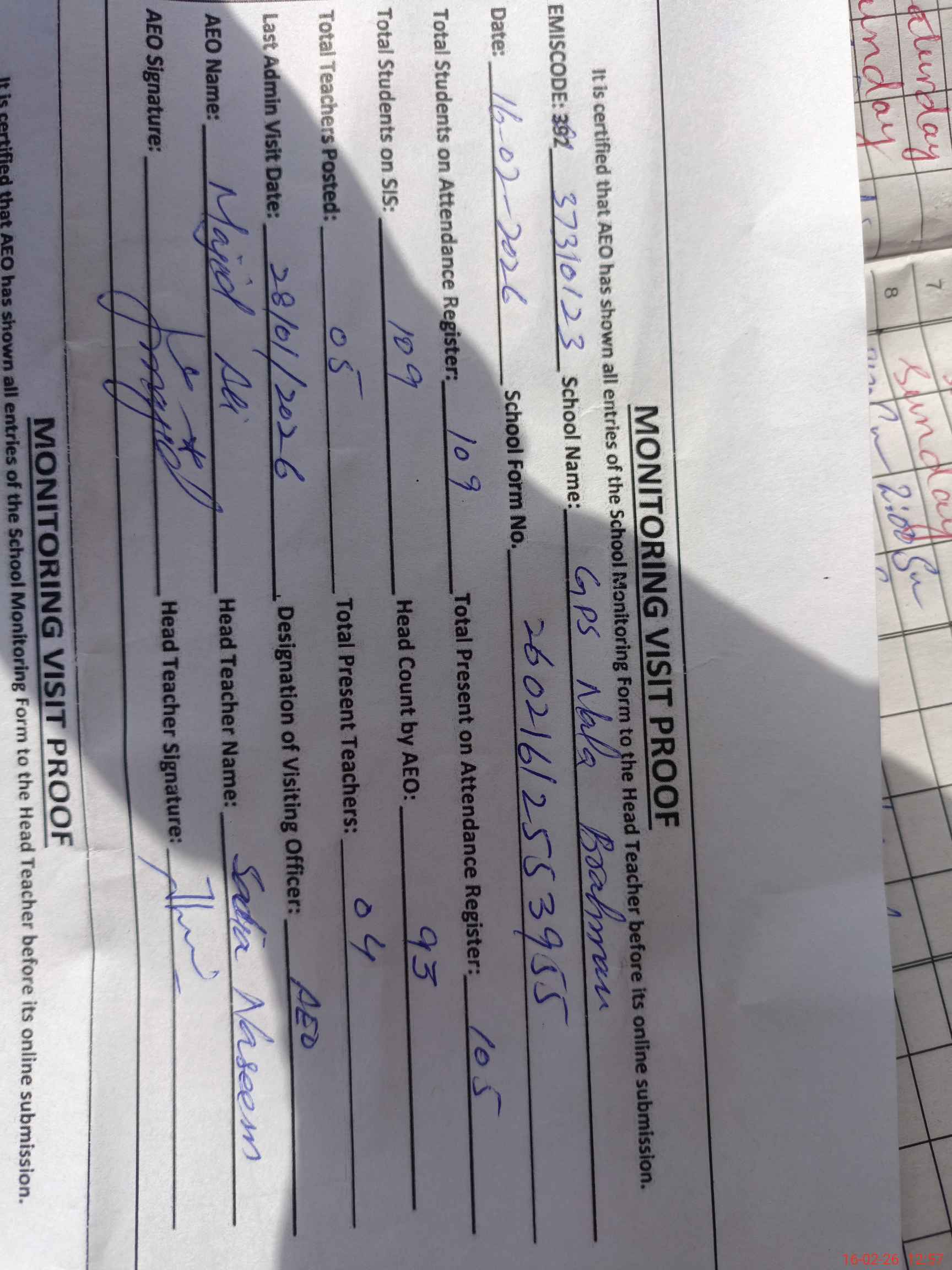 | Monitoring Date: 16-02-2026 | Start Time: 16-02-2026 12:27 PM | End Time: 16-02-2026 01:19 PM | Name of MEA: Ma**** Al**** | |