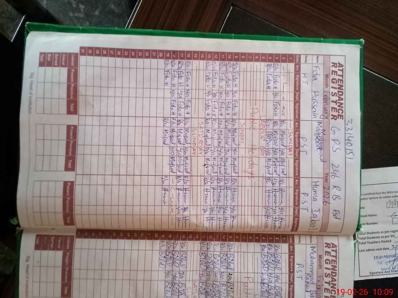 | Name: FI**** HU**** Designation: (School Headmaster's/Headmistress's) PST Phone/Cell Number: 03**** |
