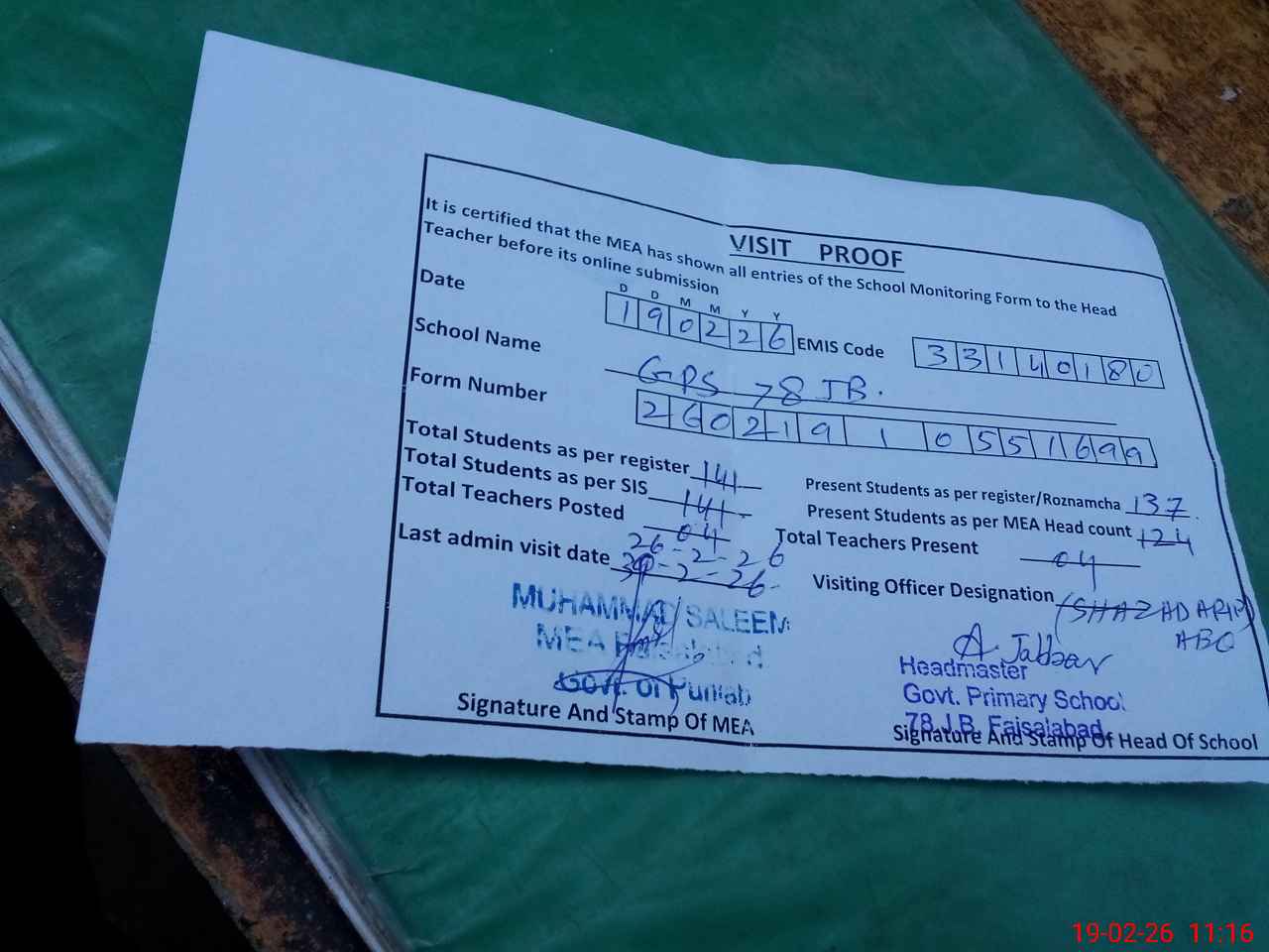 | Attendance Register | Head Teacher | MEA with School | Visit Proof |