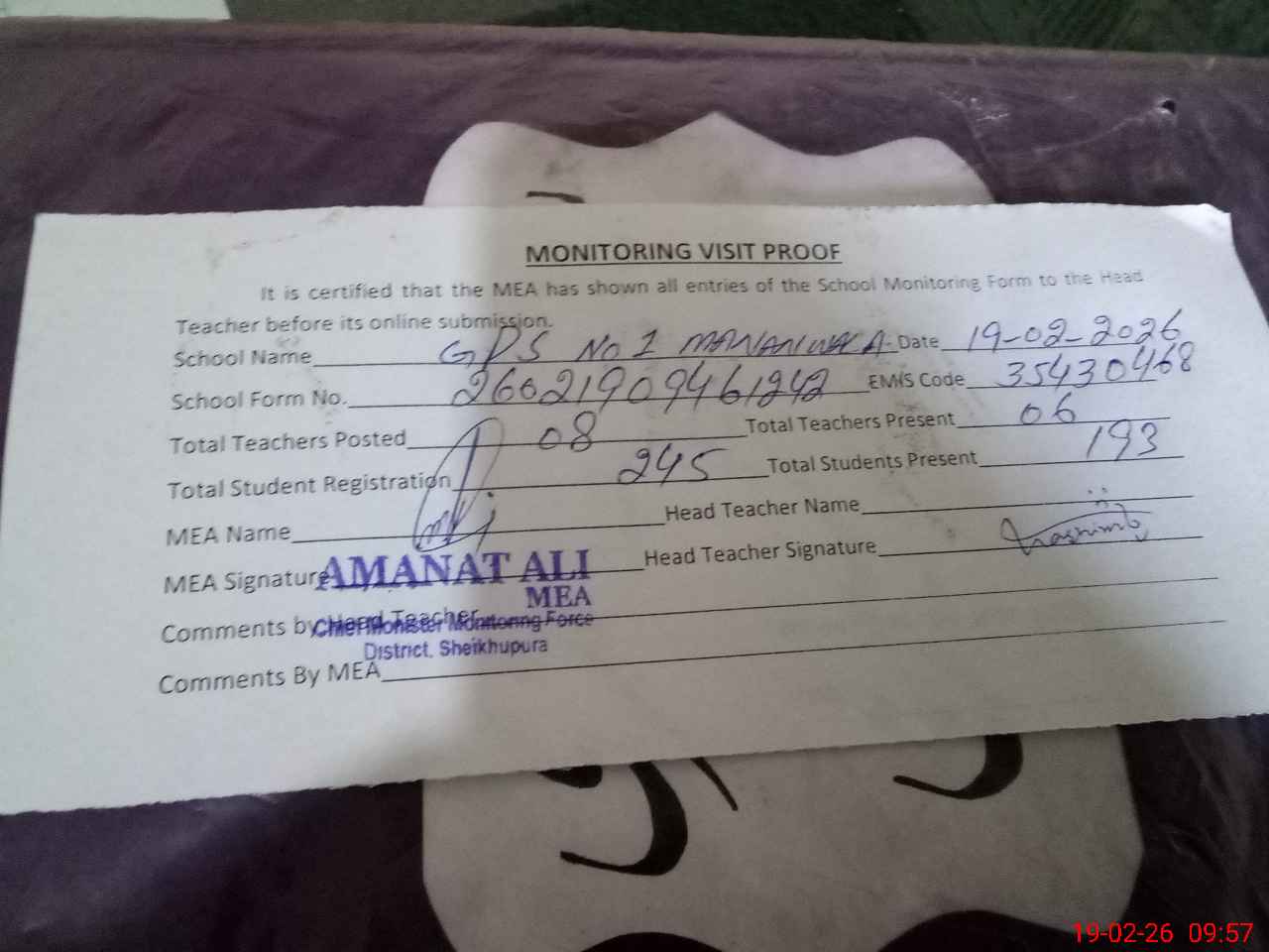 | EMIS Code: 35430468 | Name of School: GPS NO. 1 MANANWALA | |||