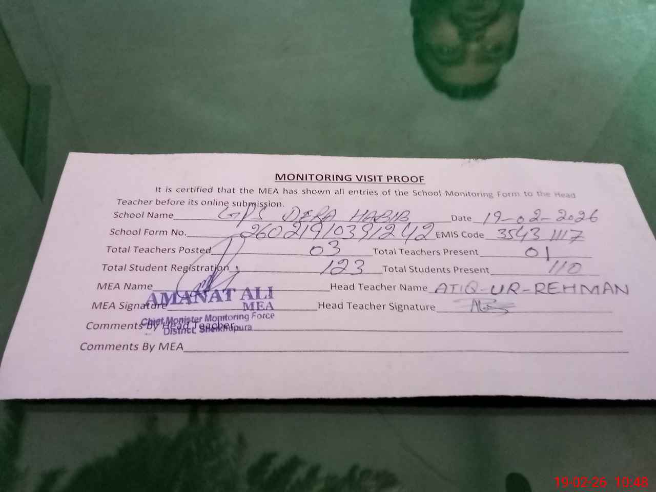 | Attendance Register | Head Teacher | MEA with School | Visit Proof |
