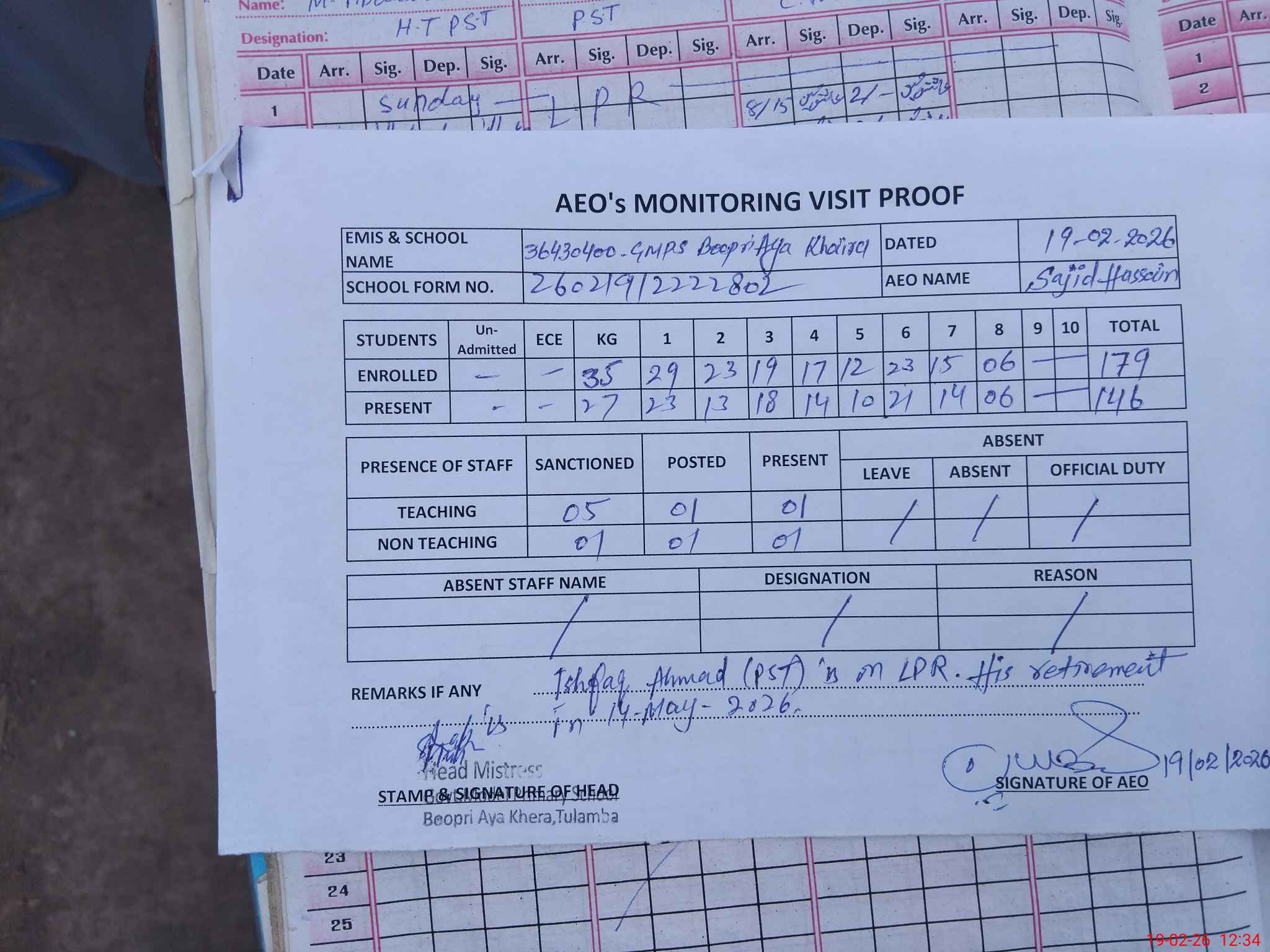| Attendance Register | Head Teacher | MEA with School | Visit Proof |