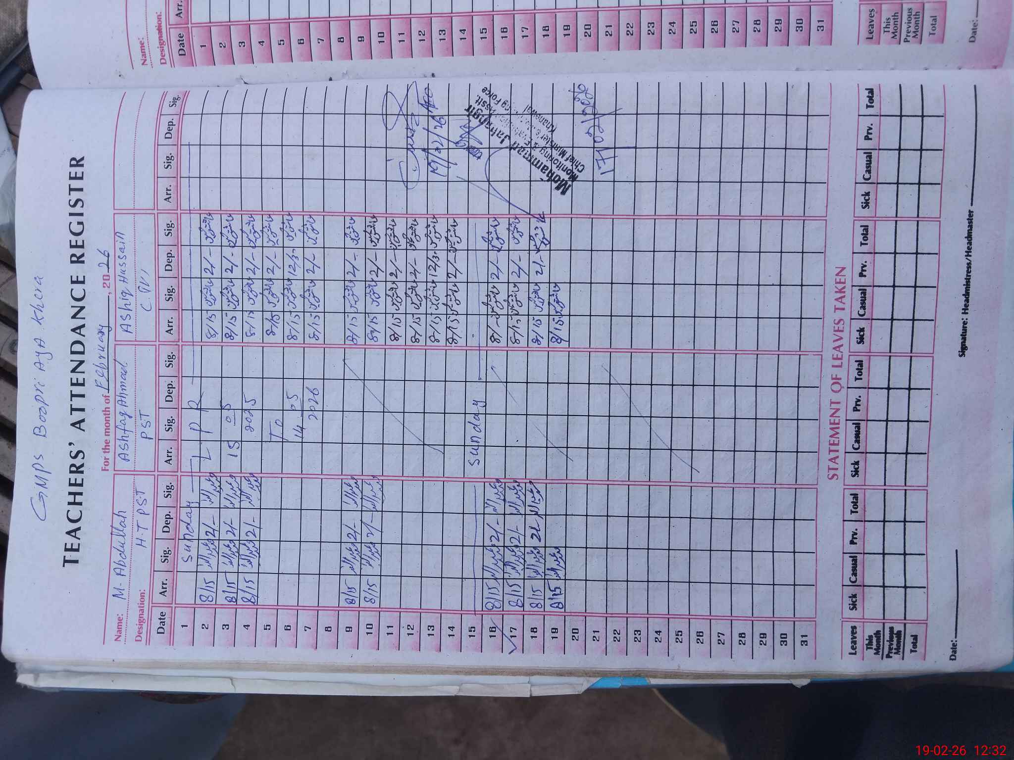 | Name: MAb**** Designation: (School Headmaster's/Headmistress's) PST Phone/Cell Number: 03**** |