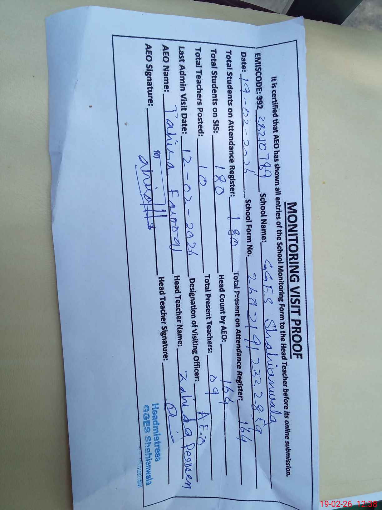 | Certified that this School was Inspected by the Undersigned MEA/DMO Today and the Information Stated Above is as Per Record. | |||||