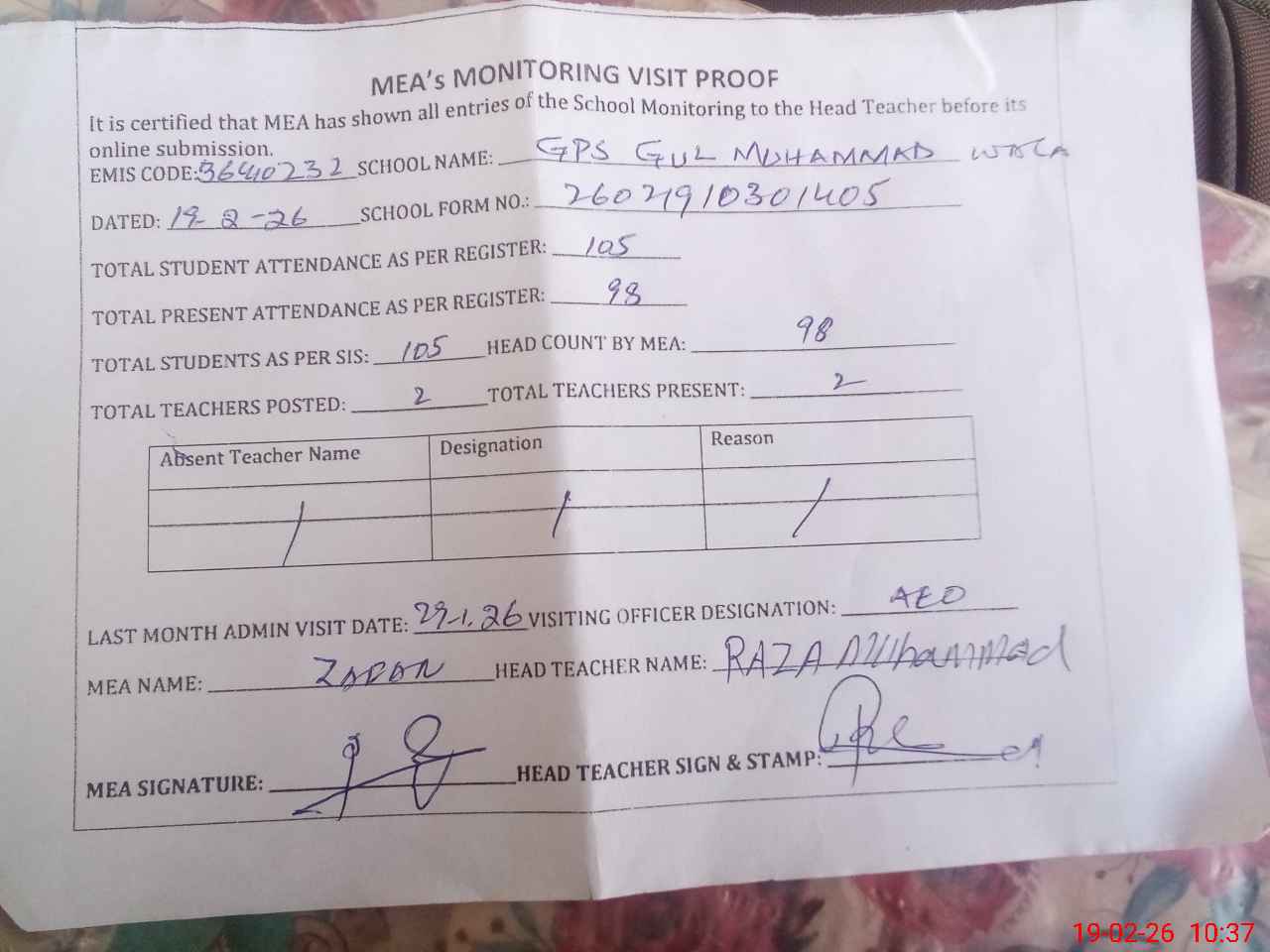| Attendance Register | Head Teacher | MEA with School | Visit Proof |