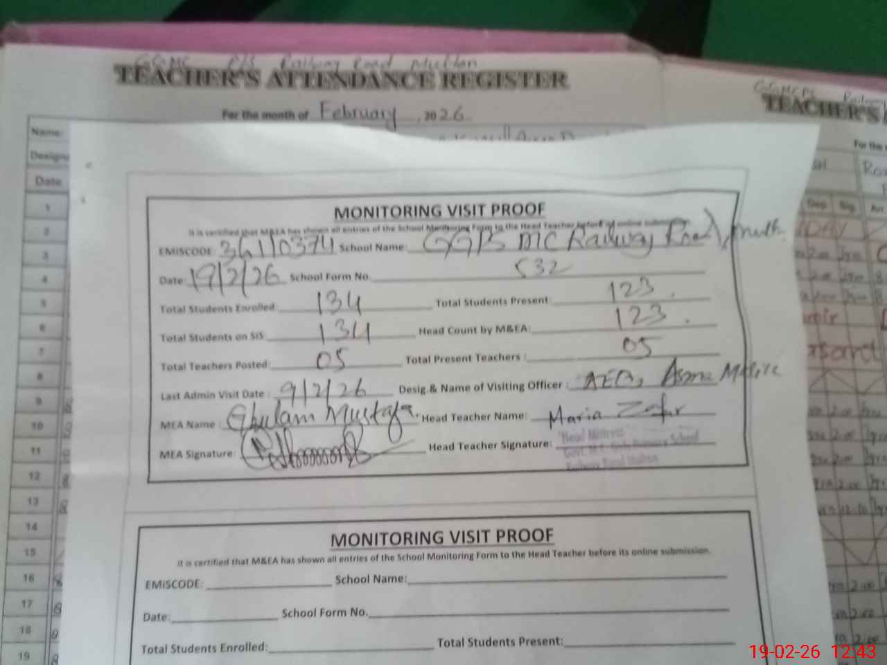 | Attendance Register | Head Teacher | MEA with School | Visit Proof |