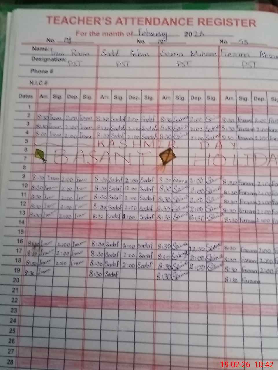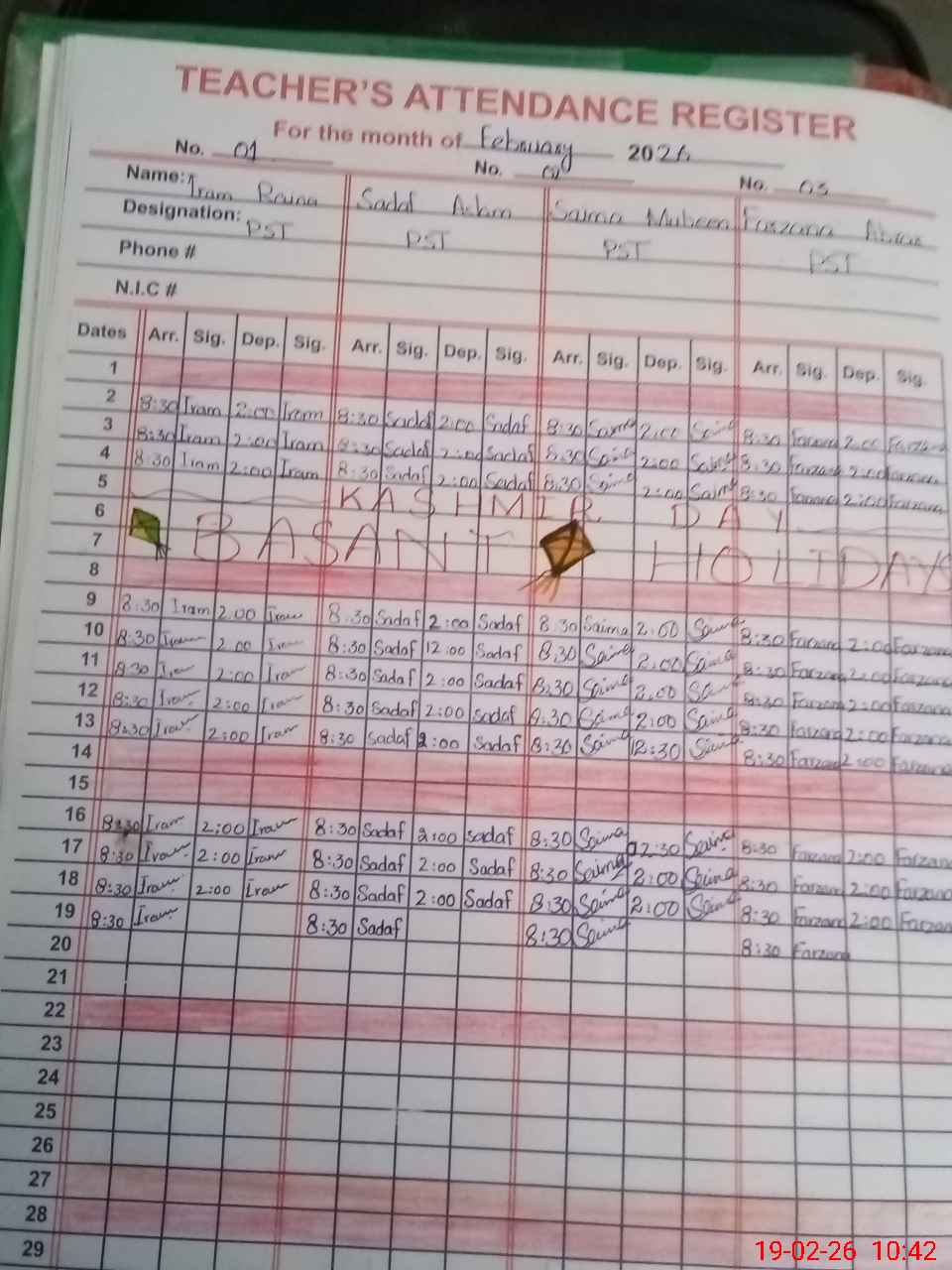 | Name: Ir**** Ra**** Designation: (School Headmaster's/Headmistress's) PST Phone/Cell Number: 03**** |
