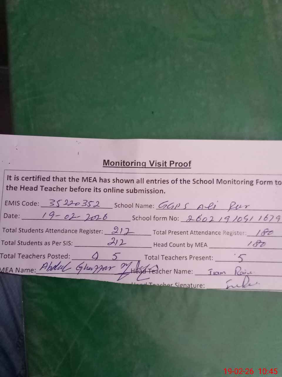 | Attendance Register | Head Teacher | MEA with School | Visit Proof |