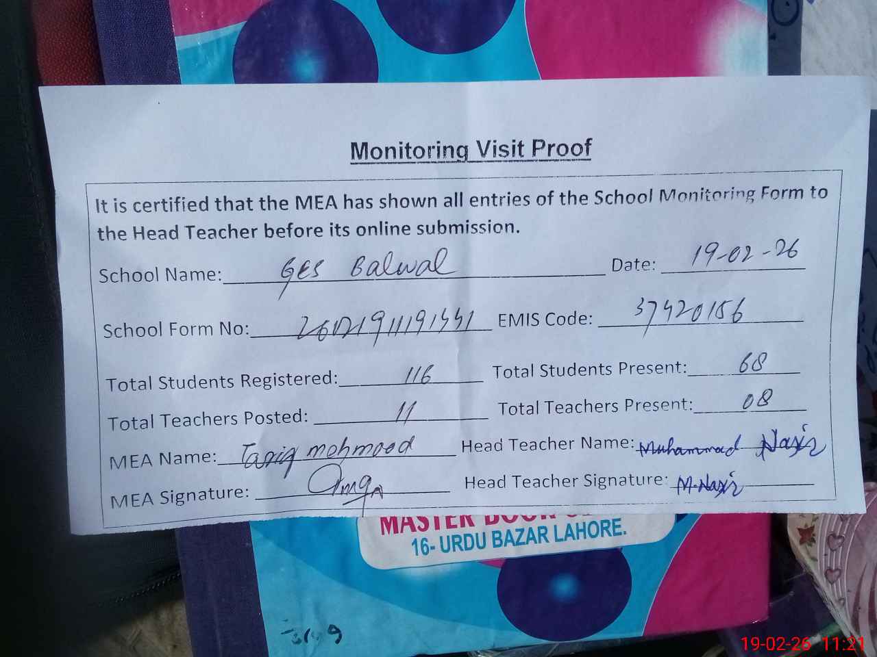 | Attendance Register | Head Teacher | MEA with School | Visit Proof |