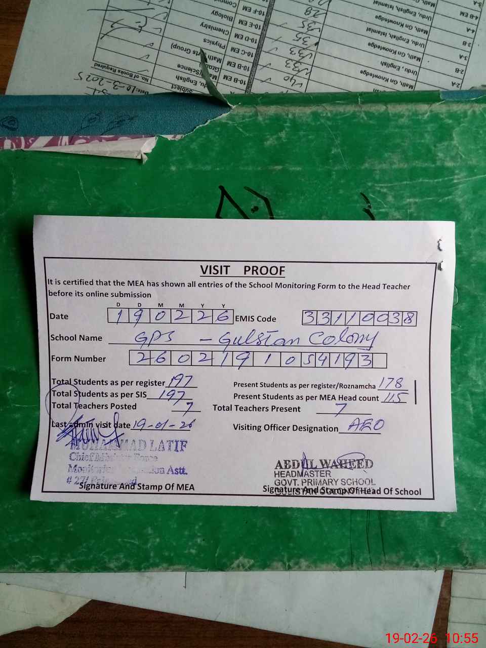 | Attendance Register | Head Teacher | MEA with School | Visit Proof |