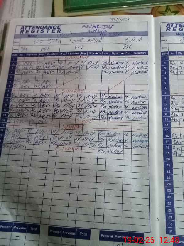 | CNIC | Full Name | Designation | R/C | Absence During Last Calender Month |