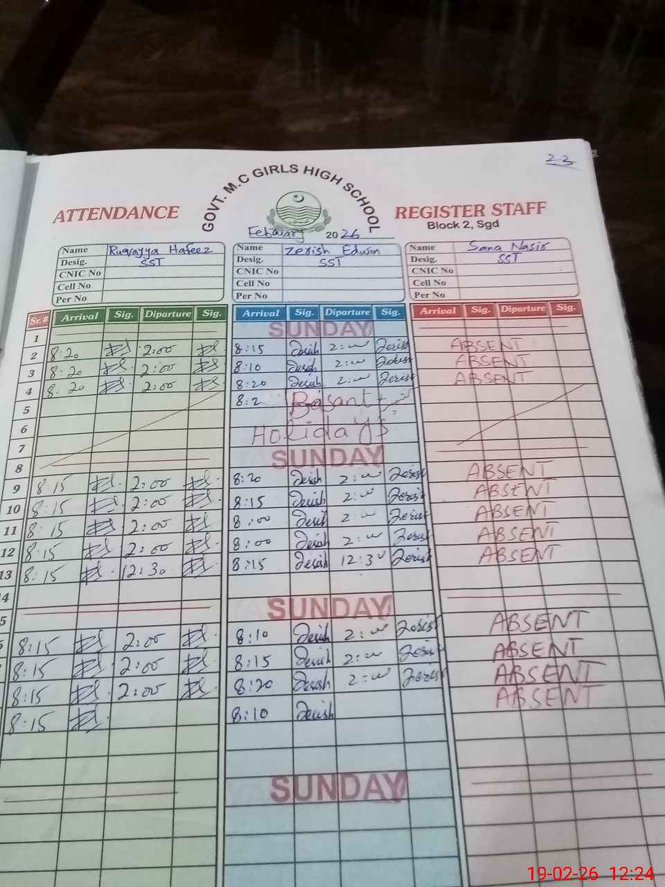 | CNIC | Full Name | Designation | R/C | Absence During Last Calender Month |