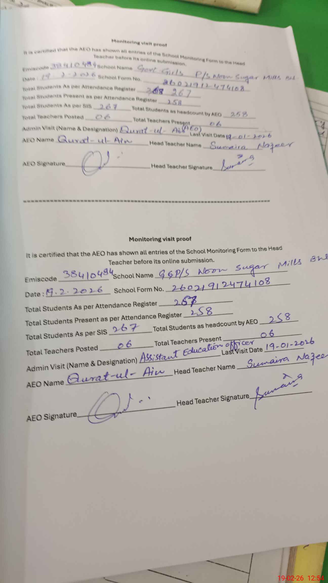 | Attendance Register | Head Teacher | MEA with School | Visit Proof |