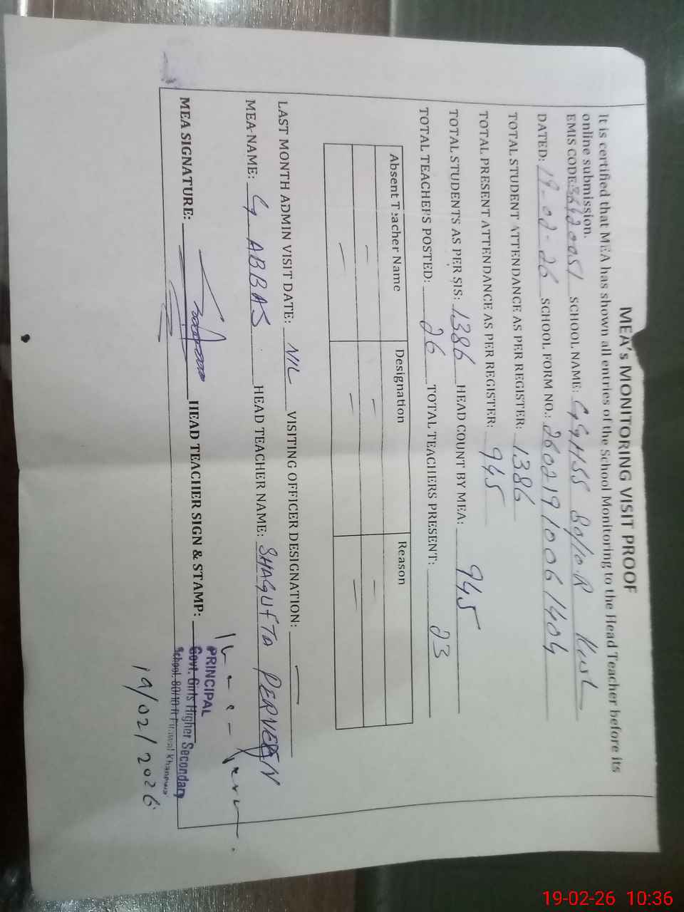 | Certified that this School was Inspected by the Undersigned MEA/DMO Today and the Information Stated Above is as Per Record. | |||||