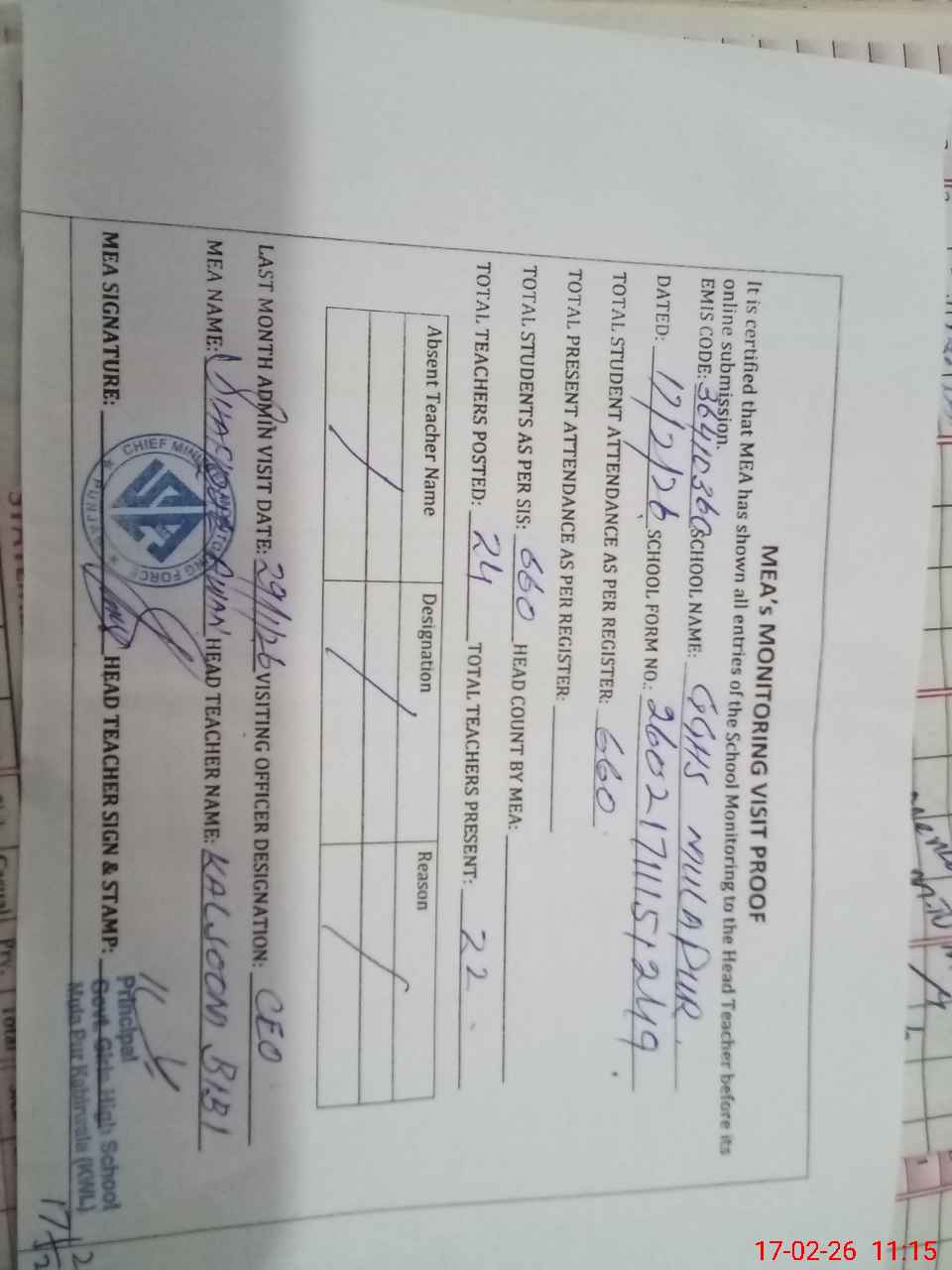 | Attendance Register | Head Teacher | MEA with School | Visit Proof |