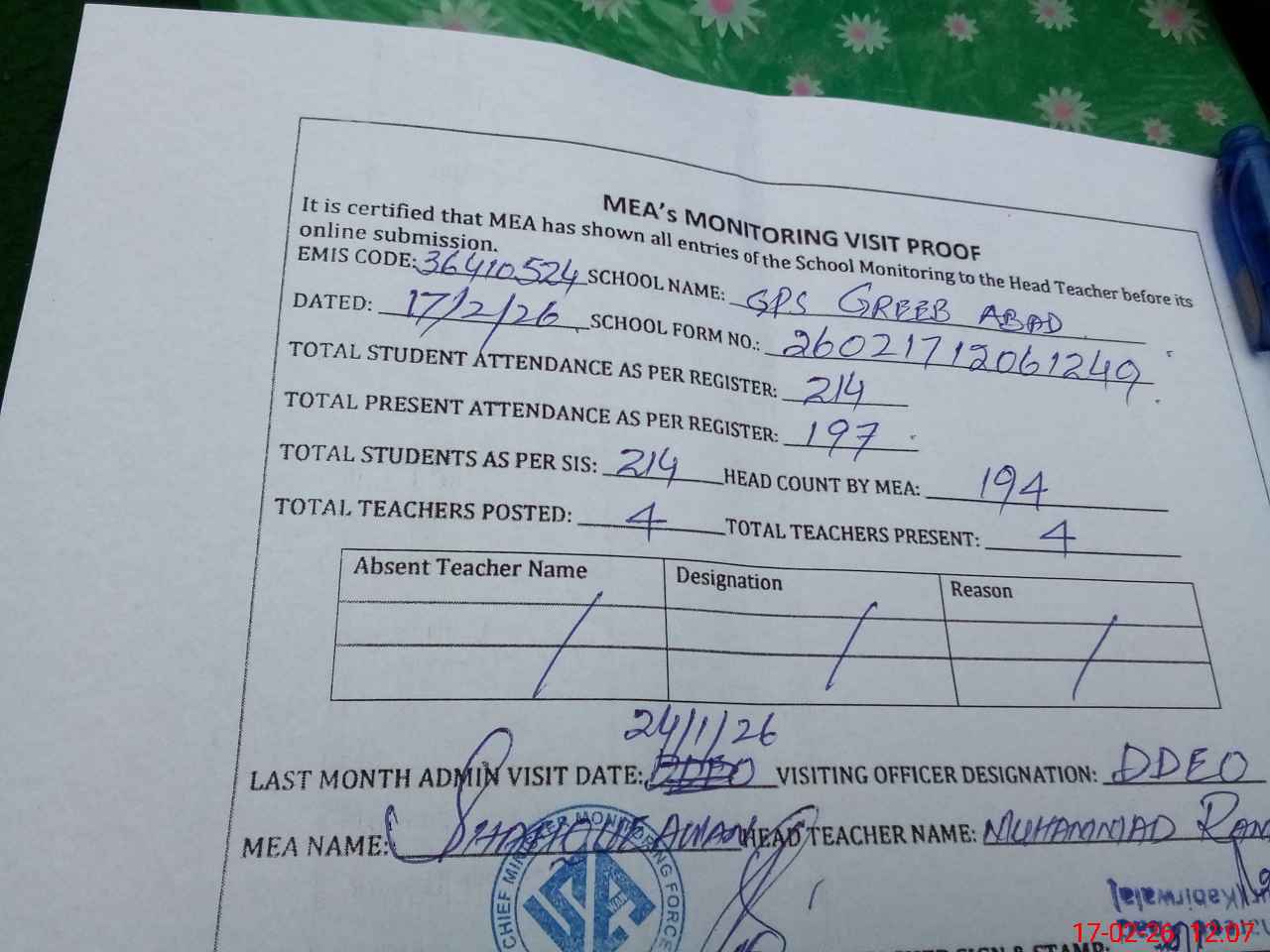 | Attendance Register | Head Teacher | MEA with School | Visit Proof |