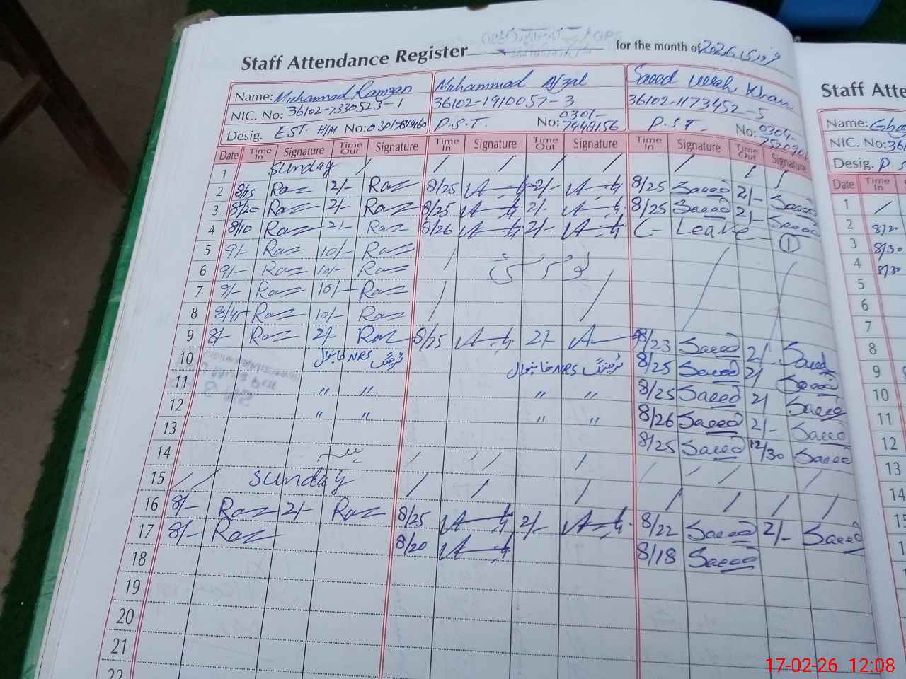 | CNIC | Full Name | Designation | R/C | Absence during last cal. month |