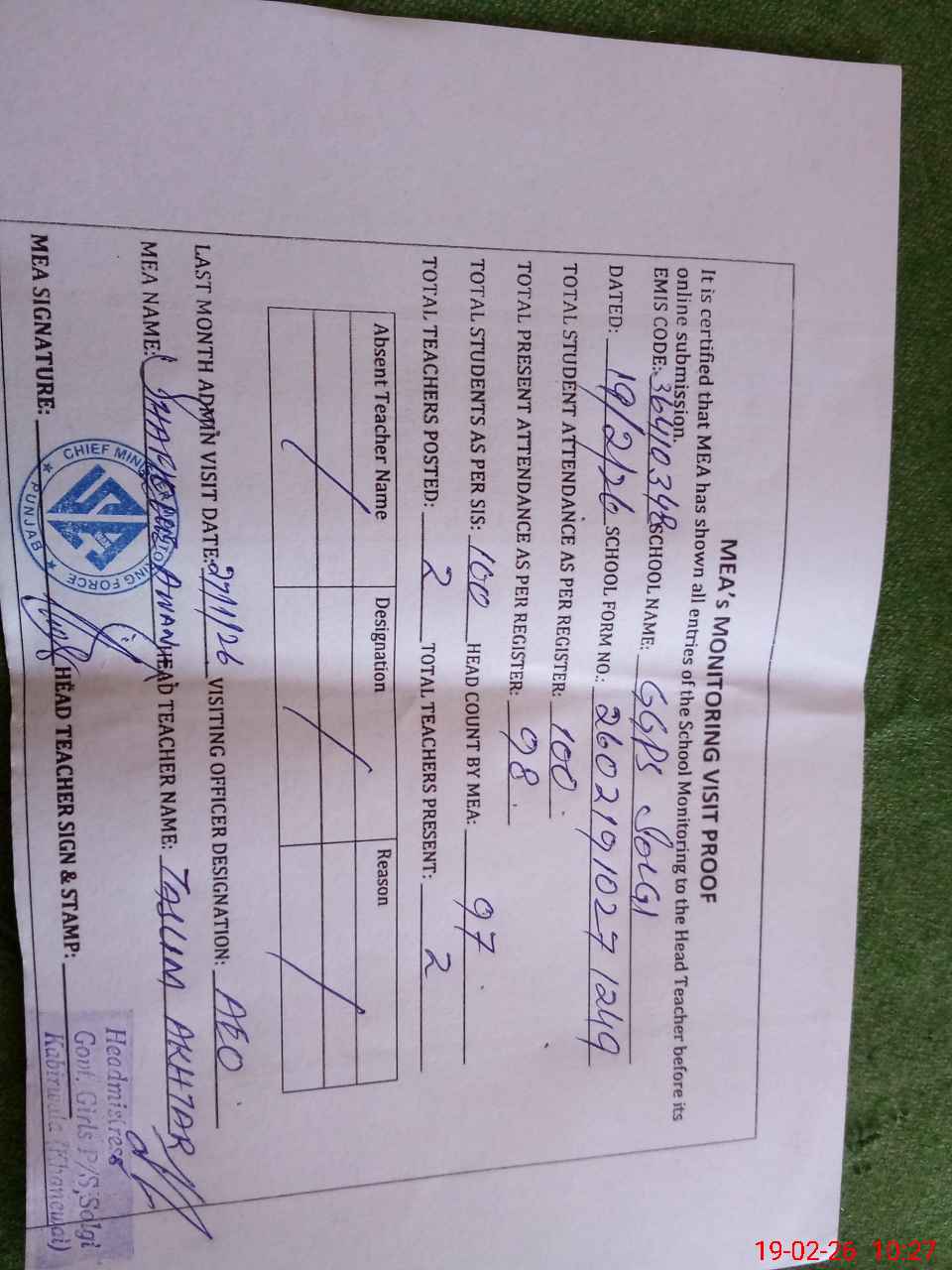 | Attendance Register | Head Teacher | MEA with School | Visit Proof |