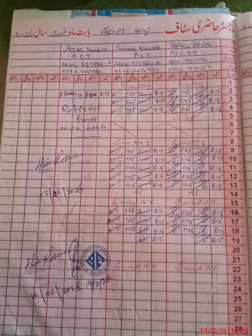 | CNIC | Full Name | Designation | R/C | Absence During Last Calender Month |