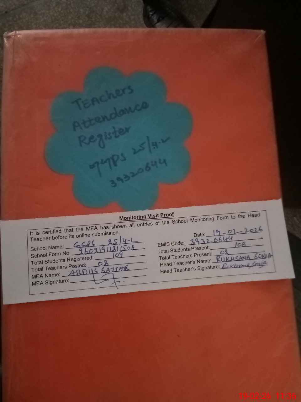 | Attendance Register | Head Teacher | MEA with School | Visit Proof |