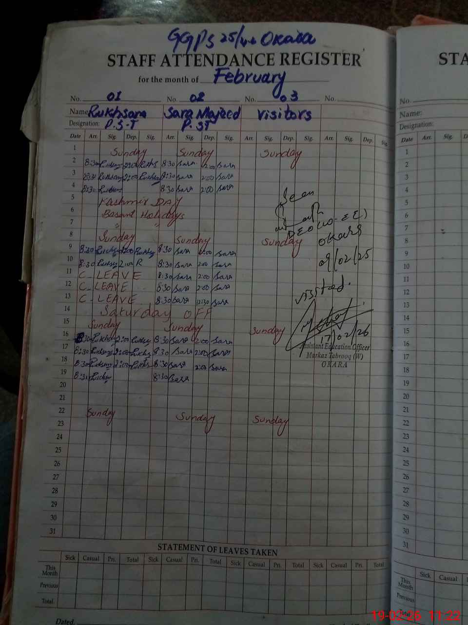 | District: OKARA | Tehsil: OKARA | Markaz: TABROOQ - FEMALE | Level: Primary | |