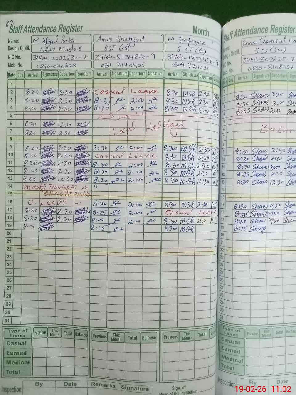 | CNIC | Full Name | Designation | R/C | Absence during last cal. month |