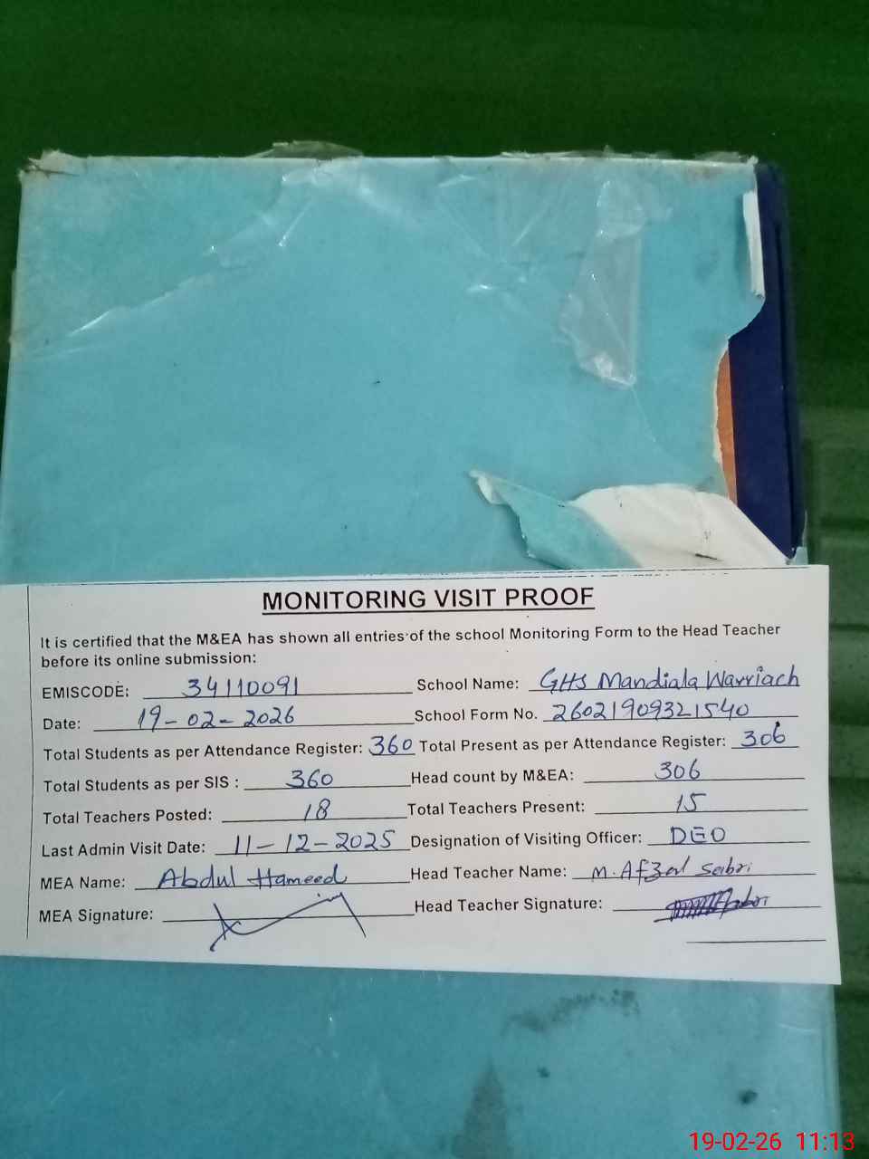 | Attendance Register | Head Teacher | MEA with School | Visit Proof |