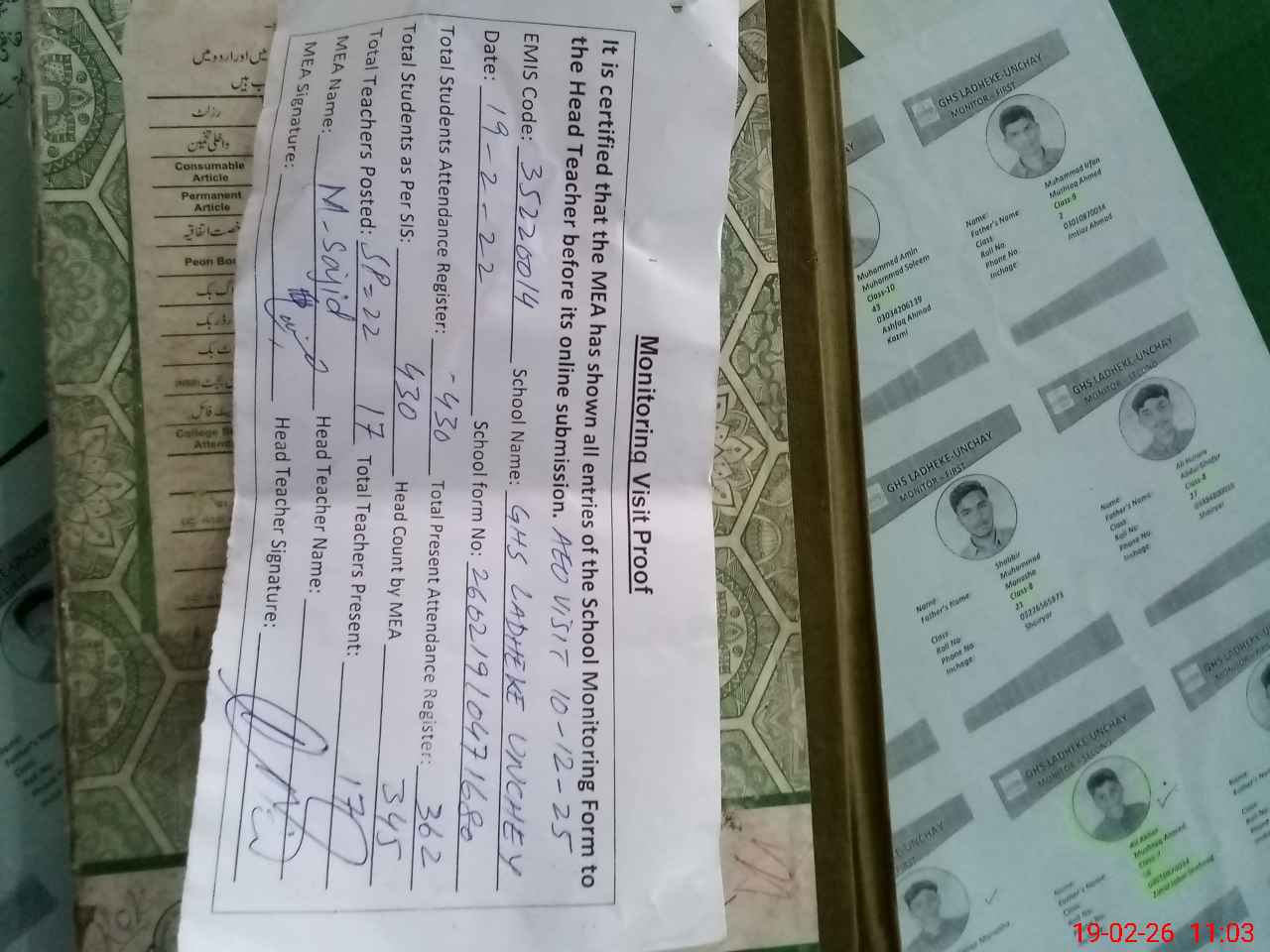 | Attendance Register | Head Teacher | MEA with School | Visit Proof |