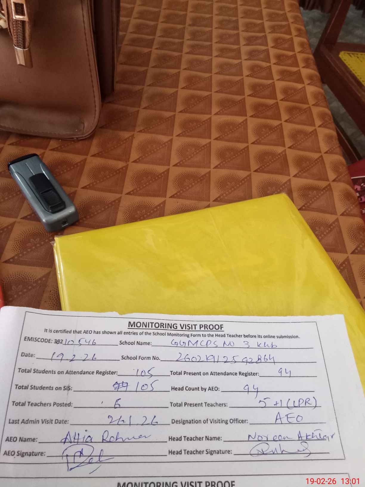 | Attendance Register | Head Teacher | MEA with School | Visit Proof |