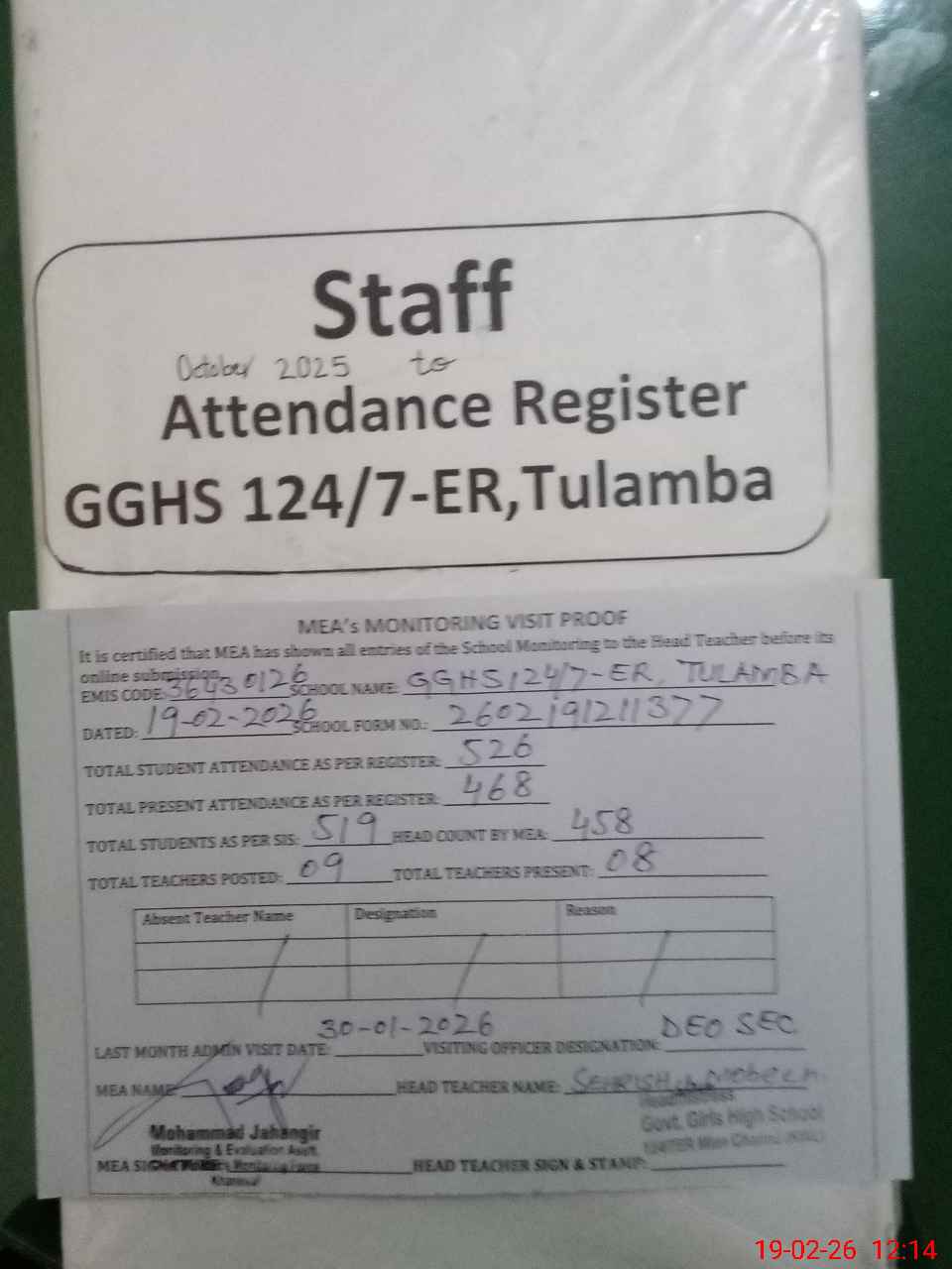| Attendance Register | Head Teacher | MEA with School | Visit Proof |
