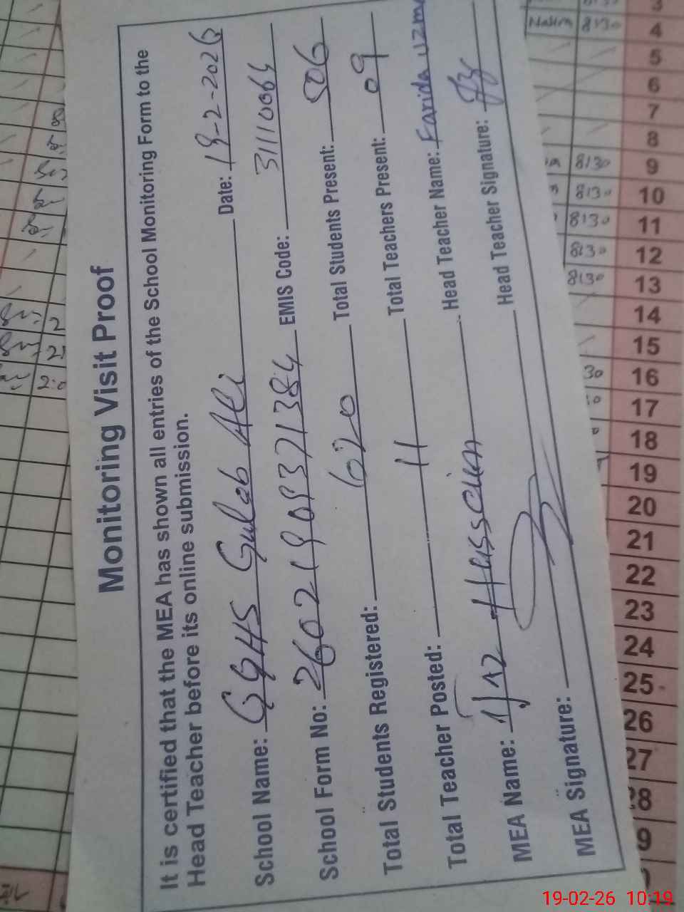 | Attendance Register | Head Teacher | MEA with School | Visit Proof |