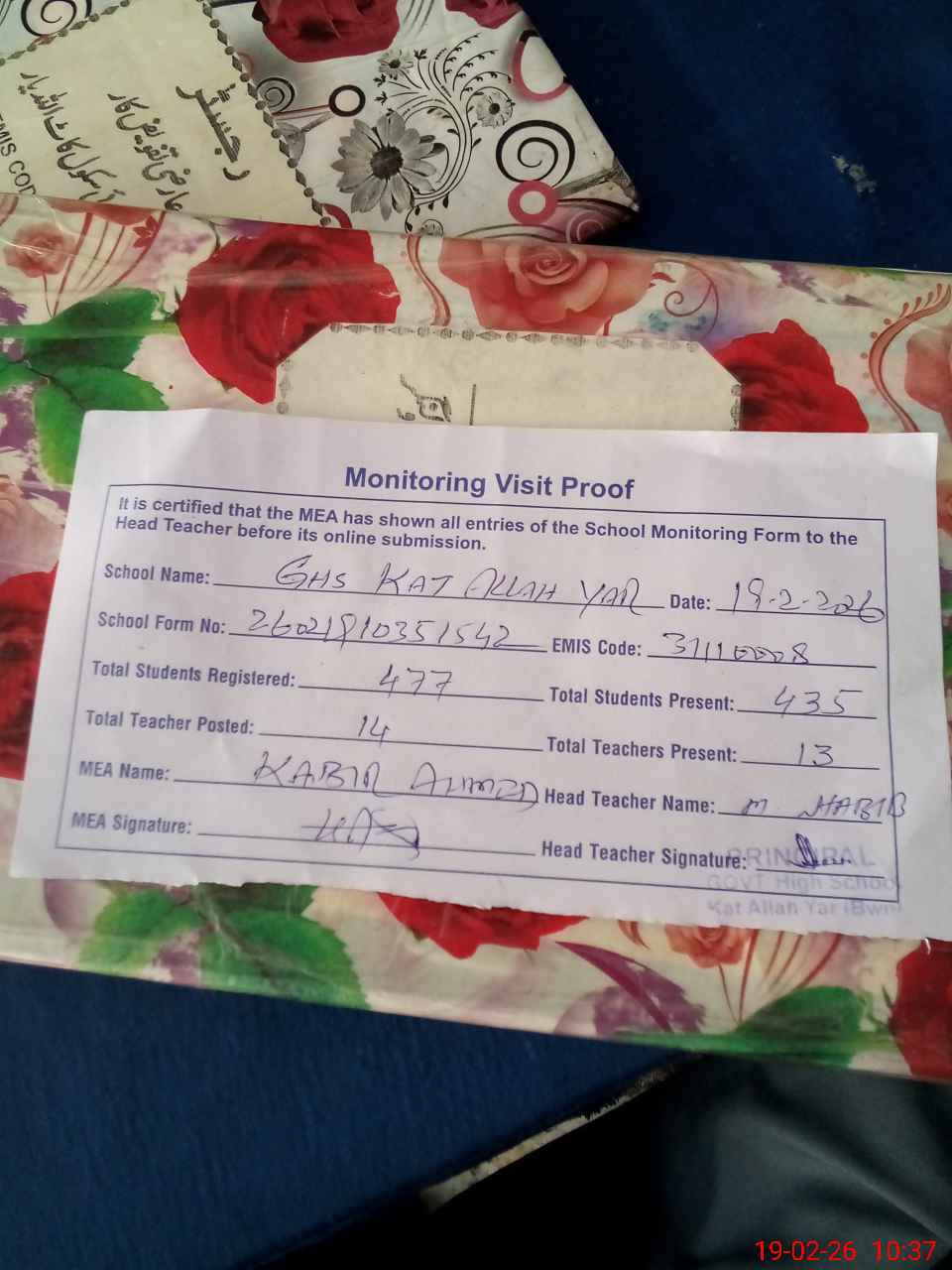 | Certified that this School was Inspected by the Undersigned MEA/DMO Today and the Information Stated Above is as Per Record. | |||||