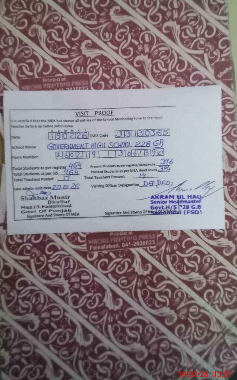 | EMIS Code: 33130365 | Name of School: GHS CHAK 228 GB SAMUNDRI FSD | |||
