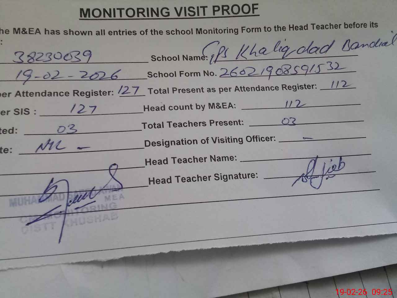 | EMIS Code: 38230039 | Name of School: GPS KHALIQ DAD BANDIAL | |||