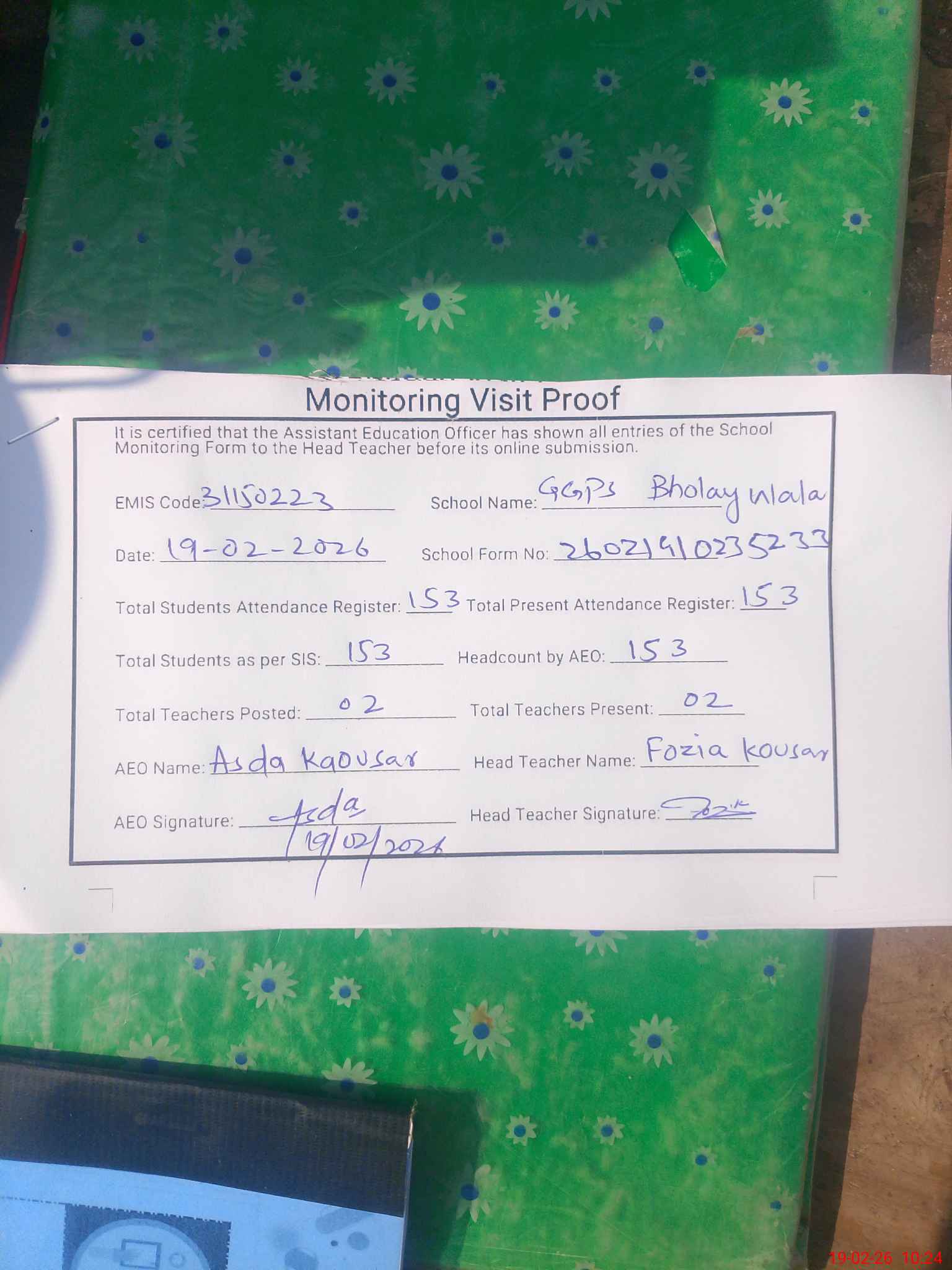 | Certified that this School was Inspected by the Undersigned MEA/DMO Today and the Information Stated Above is as Per Record. | |||||