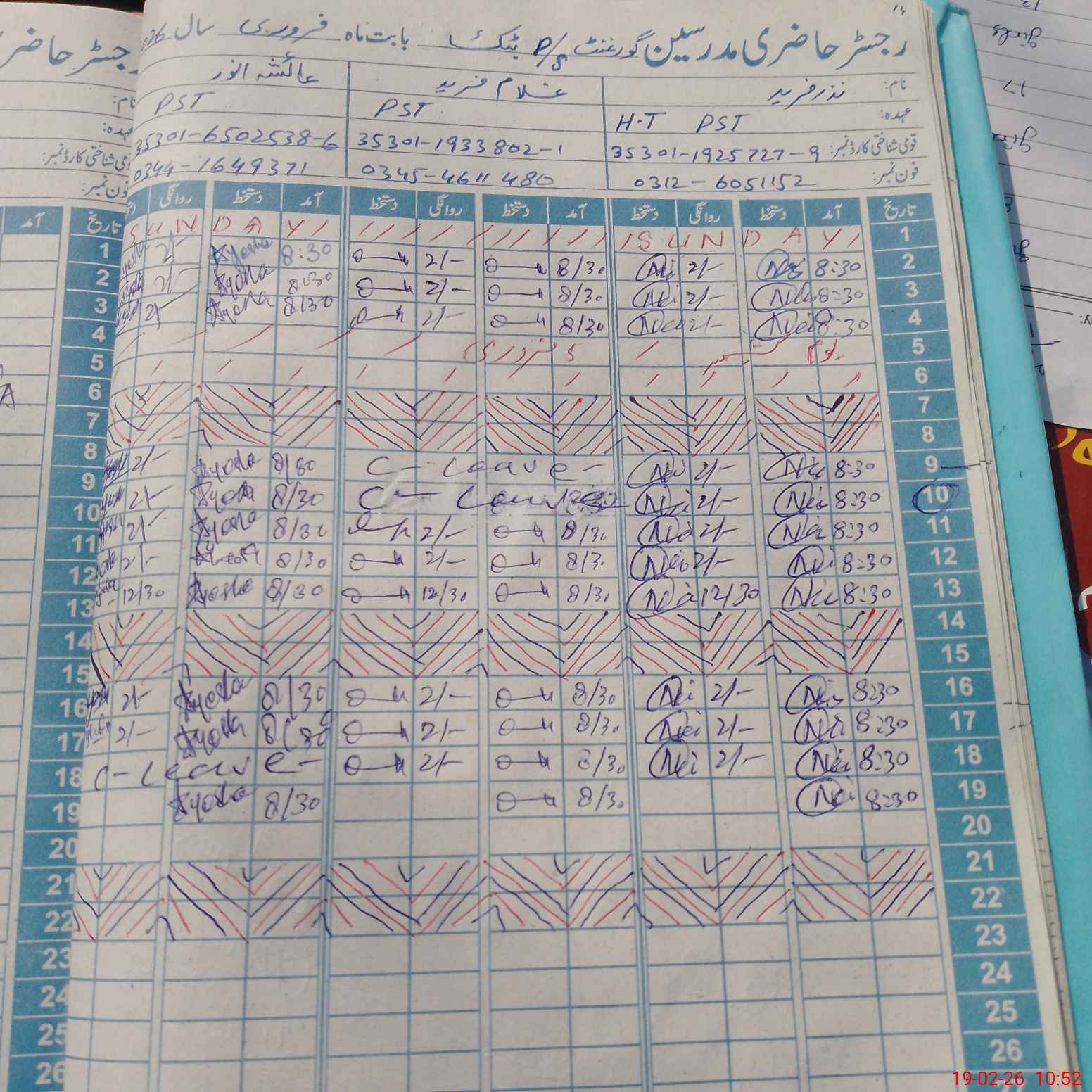 | CNIC | Full Name | Designation | R/C | Absence during last cal. month |