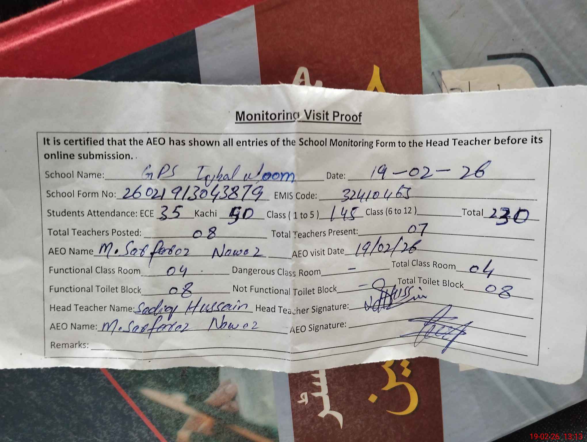 | Attendance Register | Head Teacher | MEA with School | Visit Proof |