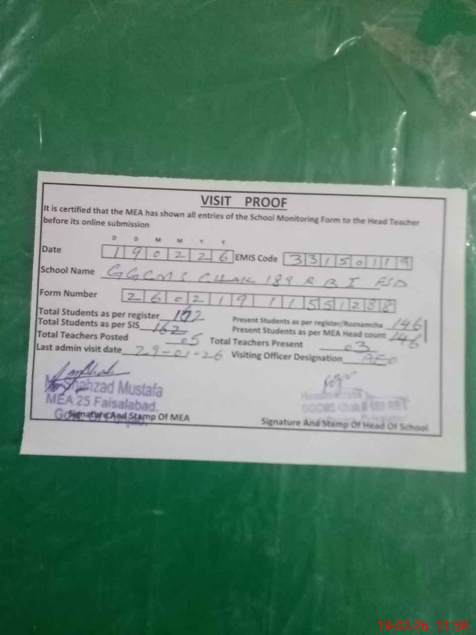 | Attendance Register | Head Teacher | MEA with School | Visit Proof |