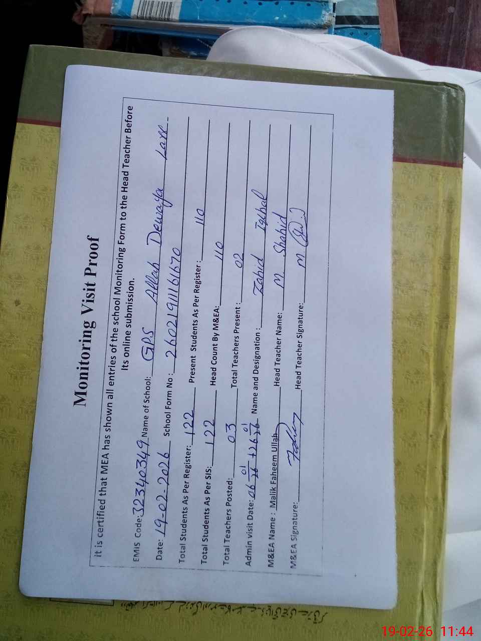 | Attendance Register | Head Teacher | MEA with School | Visit Proof |